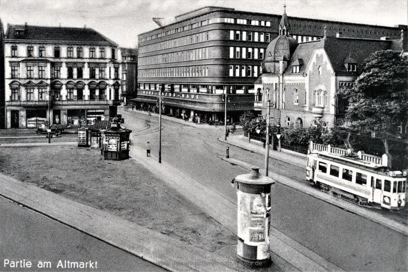 Die als Beitragsbild gezeigte Postkarte von Romanns Kunstanstalt in Herne (Sammlung Ludwig Schönefeld) zeigt den Alten Markt und das Hans-Sachs-Haus Ende der 1930er-Jahre. Die Linie 4 fuhr im Sommer 1938 vom Alten Markt zum Steeler Rathaus. Im folgenden Winterfahrplan wurde sie ab dem 2. Oktober 1938 über Heßler nach Horst weitergeführt.