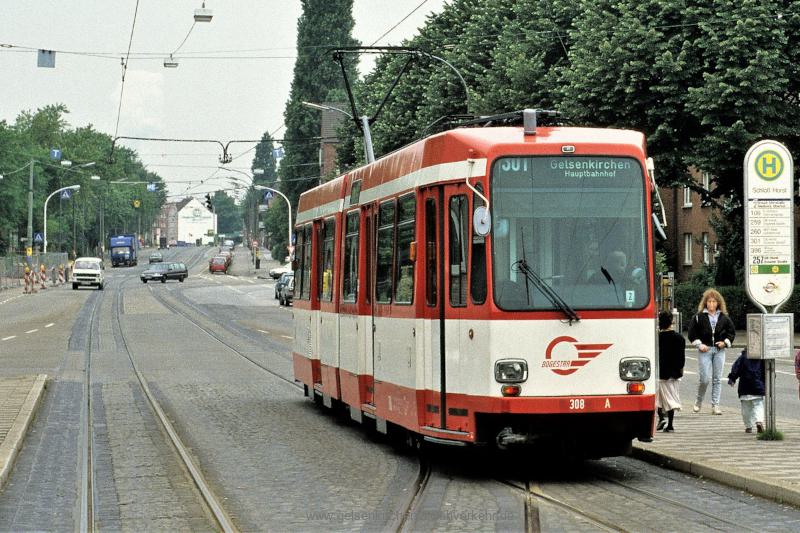 Als Stefan Höltge am 11. Juni 1995 die Endstelle „Schloß Horst“ der Linie 301 aufnahm, präsentierte sich Schmalhorststraße noch im Zustand der 1970er- und 1980er-Jahre: Der Ausbau der Haltestellenanlage für die Hochflurwagen der Essener Linie U 11 und die Variobahnen auf der Linie 301 stand noch bevor. Im Hintergrund ist der Abzweig in die Devenstraße zu erkennen.