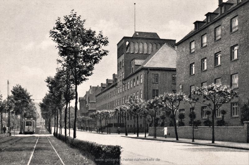 Das Beitragsbild zeigt einen der 1927 von der Mainzer Waggonfabrik Gastell für die Süddeutsche Eisenbahn-Gesellschaft gebauten Mitteleinstiegswagen auf der Zeppelinallee. Das Postkartenmotiv (Postkarte ohne Verlagsangabe – Sammlung Ludwig Schönefeld) wurde vermutlich im Sommer 1935 aufgenommen. Der Straßenbahnwagen ist als Linie 8 in Richtung Essen unterwegs. Auf der rechten Seite ist das 1928/29 errichtete Gebäude des Finanz- und Zollamtes Gelsenkirchen zu sehen.